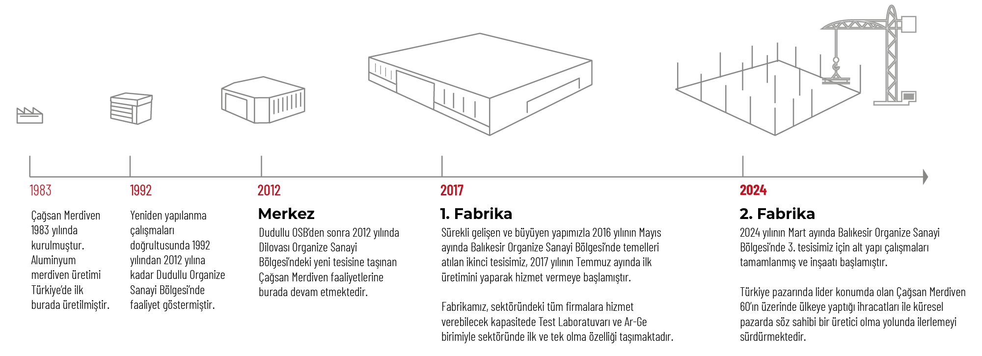 Şirketimiz, Alüminyum Profesyonel Merdivenler, Modüler İskele Sistemleri ve Ev, ofis içi kullanım için özel olarak tasarlanmış merdivenler başta olmak üzere, endüstriyel tesisler için isteğe özel platformlar ve geçiş elemanları sunmaktadır. Aynı zamanda, yüksek mukavemetli ve teknolojik erişim ürünlerimiz, stok sahaları için sunduğumuz çözümler ve bu ürünlerin tamamını destekleyen ekipmanlarımız, şirketimizin temel faaliyet alanlarını oluşturmaktadır. Ar-Ge çalışmalarımız, ürün tasarımı, üretimi ve pazarlaması süreçlerindeki derin uzmanlığımızla, müşterilerimize yenilikçi ve güvenilir çözümler sunmayı hedeflemekteyiz.